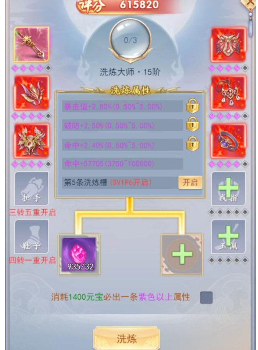 此外,除了每次洗炼的品质为随机之外,洗炼获得的数值也是随机的。当洗炼出满意的洗炼结果时,可以对已有的属性的槽位进行锁定,锁定后再次洗炼时该槽位的属性就不会变化啦~