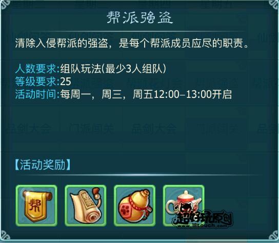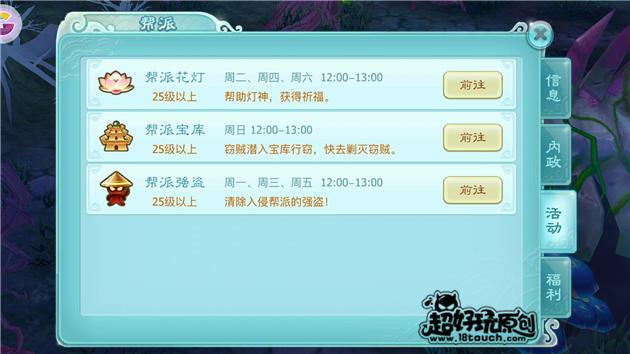 目前版本中,帮会活动已开放的有三种玩法,帮会强盗,帮会花灯,帮会宝库。开放时间是周一到周日中午12点到13点,轮流开放,下面就来和大家详细说说各个玩法的玩法攻略。