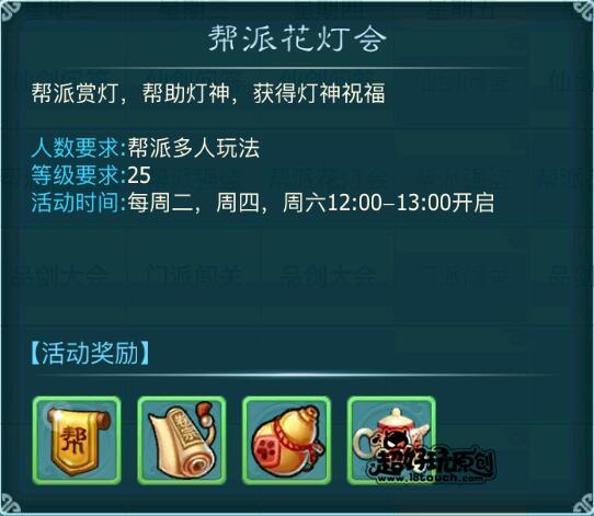 在活动开启后,在帮会中心会刷新一个大花灯,点击会弹出来三项服务:修灯框、剪灯花、贴灯纸。点击对应的任务,可增加该项任务的完成次数,当每项任务各完成10次时,帮会内刷出小花灯,点击小花灯可获得花灯奖励。