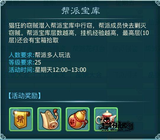 领取方法:定时活动,达到设定时间就会开启,同时会显示在“活动”界面中,在帮派中找到帮派管理员进入帮派宝库。