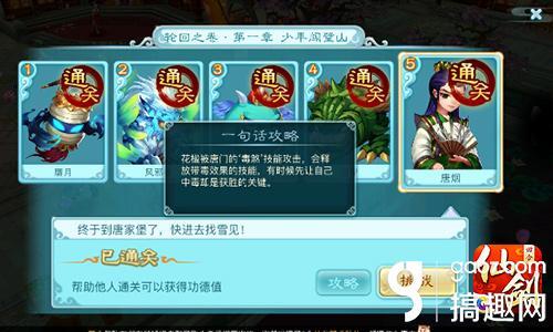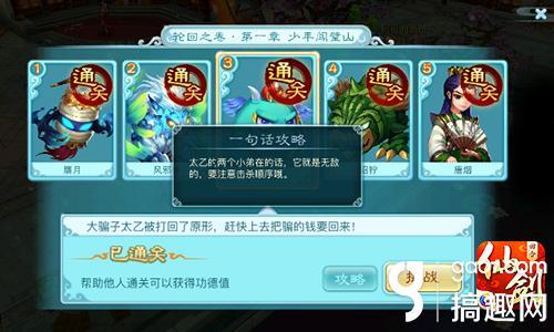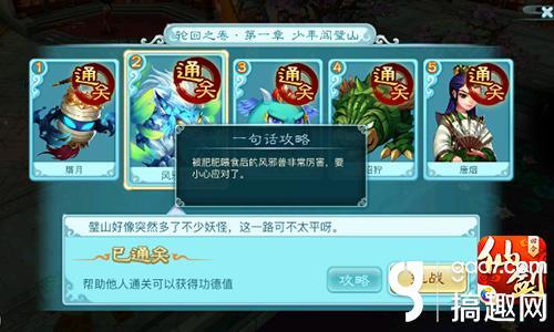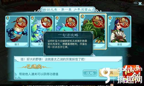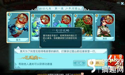 每一关的下面,都会有一个“攻略”的按钮,上面写着一句话攻略,点开看下就能明白本关最重要的难点在哪里,闯关之前一定不要忘了看一下喔。赝月关卡中,酒坛妖的个数要多于小赝月,否则大赝月会发怒的,所以要优先击杀左右两个小赝月然后集火BOSS。这关比较简单,装备过关很容易就过啦!