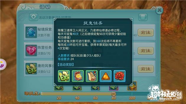 捉鬼任务:玩家每天前40次没有功德值,正常获取奖励。之后可继续捉鬼50次,每次只有少量经验和1点功德值,每天最多可获取50点功德值;