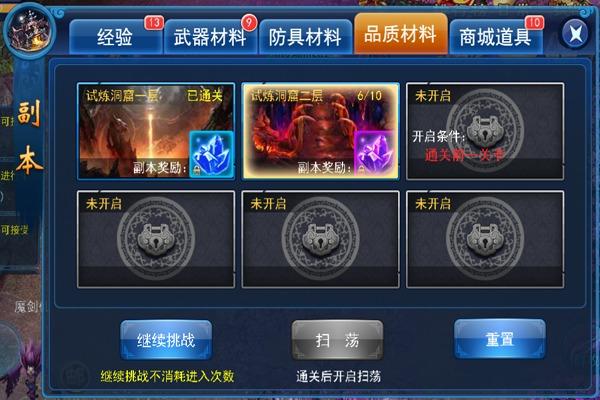 品质副本分为4层,每层分为10个小关卡,后一层都需要先通关前一层才开启,每层对应掉落品质水晶;