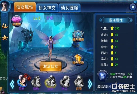 在仙女属性界面上可查看仙女形象,及其对应属性和技能,仙女可提升等级,等级达到40级后可提升仙女资质(使用对应仙女召唤卡或资质丹)。