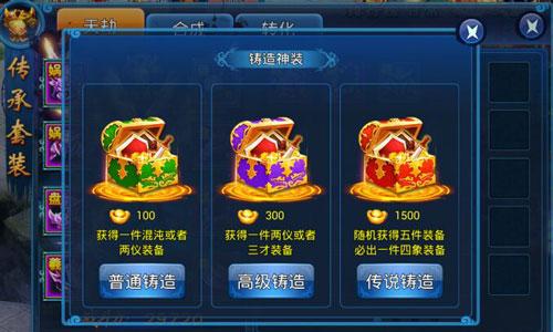在《天天爱仙侠》传承套装玩法中,共有三种铸造装备的方式:花费100元宝获得一件混沌或者两仪装备,花费300元宝获得一件两仪或者三才装备,以及花费1500元宝获得五件装备,其中必出一件四象装备。这三种模式花销不同,铸造的神装也不同。而在传承套装中,又分为伏羲、盘古、女娲三种套装,每个套装集齐3、5、8件即可激活套装效果。最佳的效果肯定是集齐8件同属性套装激活效果,如果不能的话有选择地激活3、5套装效果也能搭配出不错的属性。