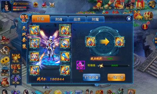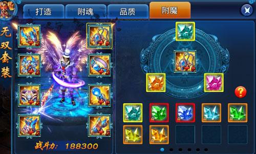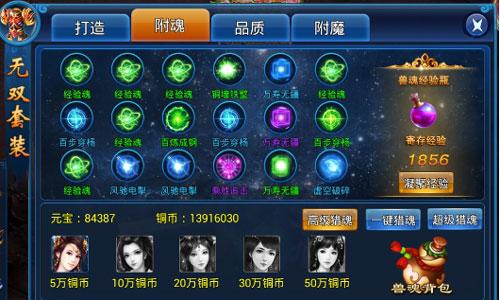 仙侠界最上品的天材地宝,无一不是可以提升等级的。正如《天天爱仙侠》无双套装,可以通过附魂和附魔来增加套装属性。每件无双套装可以装备五个不同属性的兽魂,兽魂最终加成属性与装备品质有关系,橙色装备可以获得100%加成。兽魂可以花费一定铜币进行猎取,不同颜色加成的属性不等。至于无双套装附魔,则是在每个装备上镶嵌三颗不同属性的魔玉,魔玉可以通过商城购买,也可以通过击败锁妖塔、破碎天庭中怪物获得。