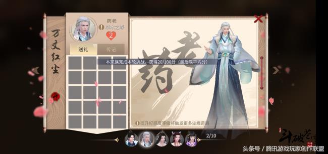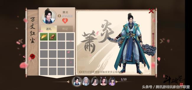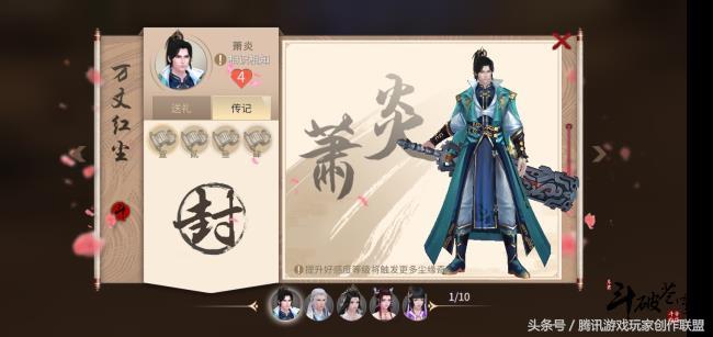 如图所示尘缘玩法在图片的右下角有个万丈红尘,没错,就是它了,打开我们就能看到尘缘系统玩法了,首先我们将于小说的主角萧炎第一个开启尘缘说起萧炎相信大家都记忆犹新。相信玩这个游戏的很多都是斗破迷,我也是其中一个,打开界面我们会看到尘缘里有一个送礼和传记两个功能。