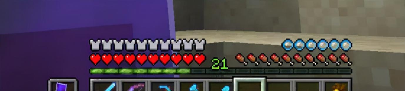 游戏正下方为道具栏。道具栏上为经验条,显示自己当前的等级。经验等级可以用来修复物品或者附魔,经验条上方为人物的生命值,右边为饱食度,再上方则为护甲值和氧气值,饱食度保持满状态可以恢复血量,饱食度不足时将不可加速,吃各种食物可以增加饱食度。人物在潜水状态时将持续消耗氧气值,当氧气值耗尽时将持续扣除生命值。所以大家在水下探索的时候一定要注意氧气值的变化。‘