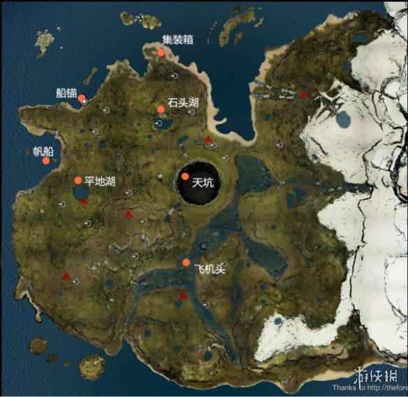 在地图右上角红三角处有个洞穴入口(请先获得登山镐,不然就回不来了。这个洞穴是最危险的洞穴,有很多变异体和野人,需要做好战斗准备。最后准备点炸药),里面有通往天坑的入口。