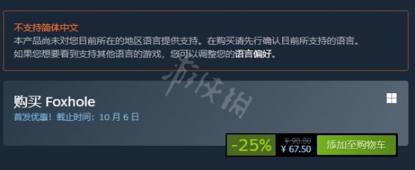 Foxhole散兵坑steam国区价格是67.5元,原价是90元,首发优惠截止时间是10月6日。目前已经截止。