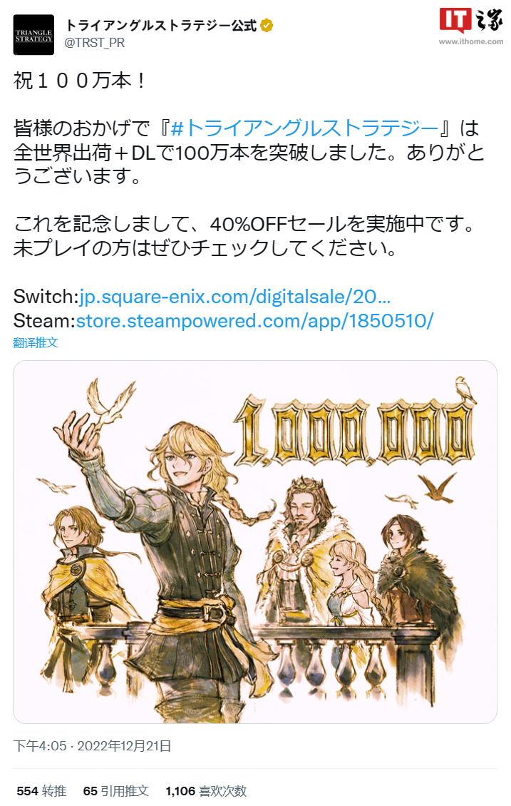 12 月 21 日消息,由 Square Enix 开发的策略型角色扮演游戏《三角战略》(Triangle Strategy)于今日公开实体版出货和下载版销量突破 100 万套的消息,本作目前已在 Switch 与 Steam 平台开启 6 折优惠。《三角战略》于 3 月 4 日在全球推出 Switch 版,并于今年 10 月 13 日推出 Steam 版,支持中文。