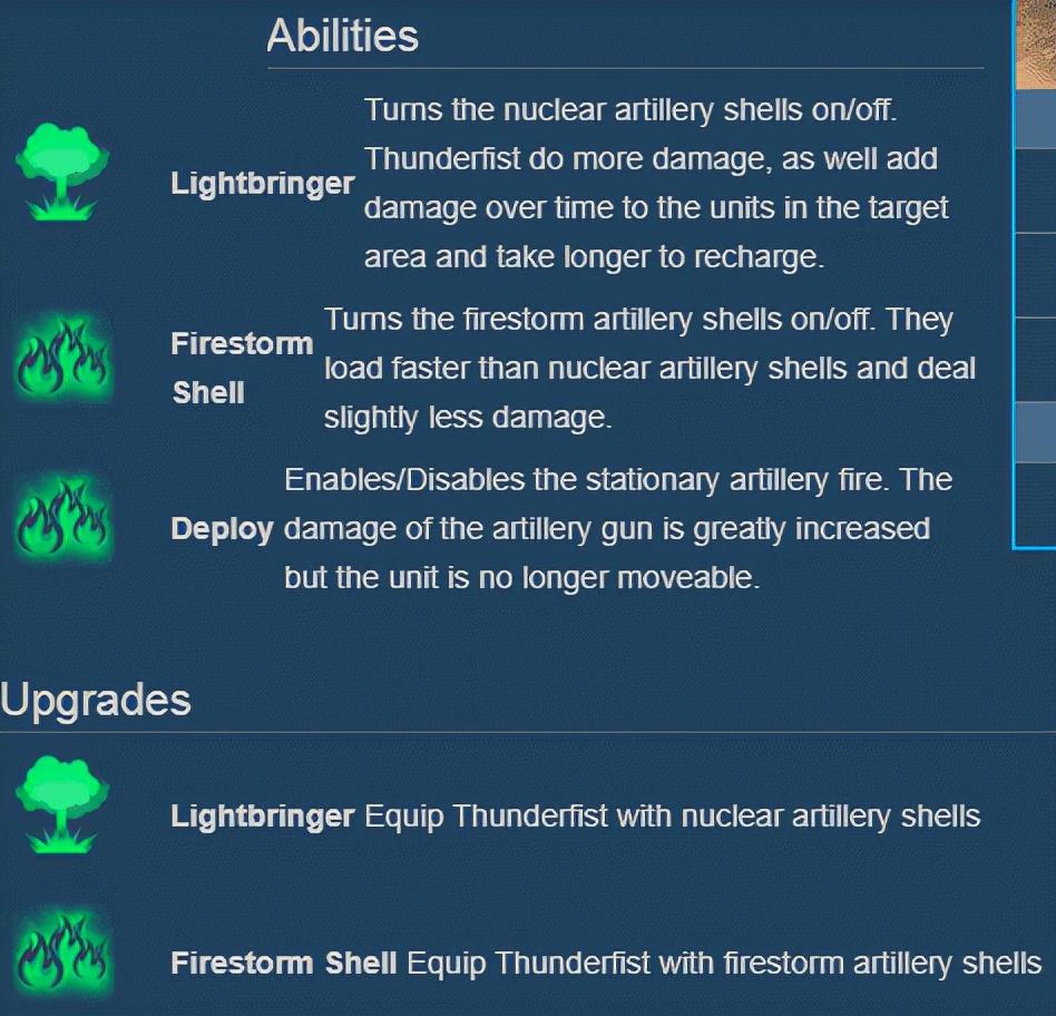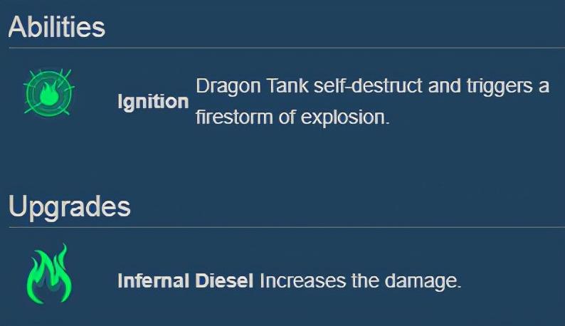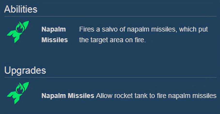 技能:凝固汽油弹:齐射凝固汽油弹造成区域性火灾;