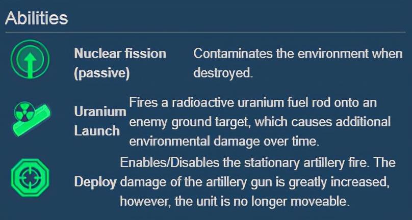 2.发射放射性铀燃料棒,污染一片区域,附近的敌人呆得越久伤害越大;