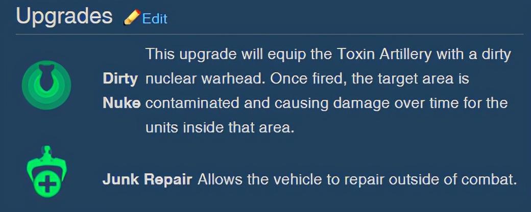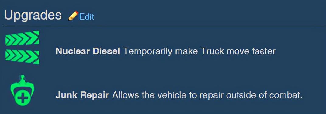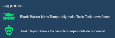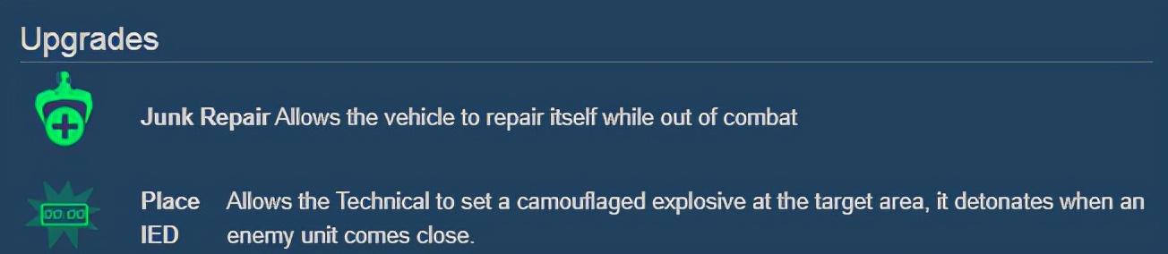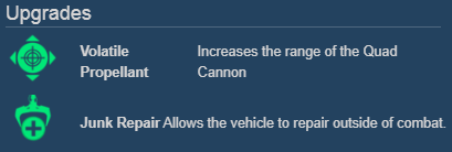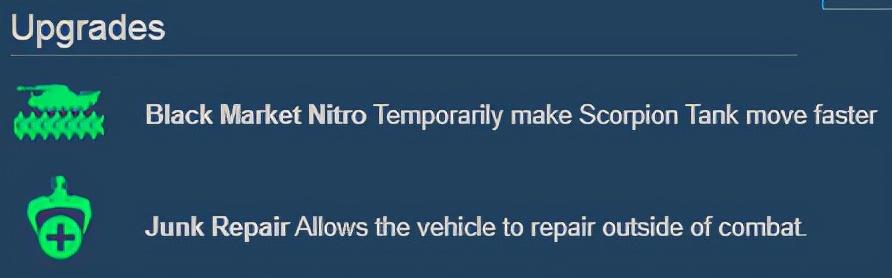 升级:1.挥发性推进剂:增加射程;2.垃圾修理:允许车辆在非战斗状态下自行修理