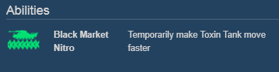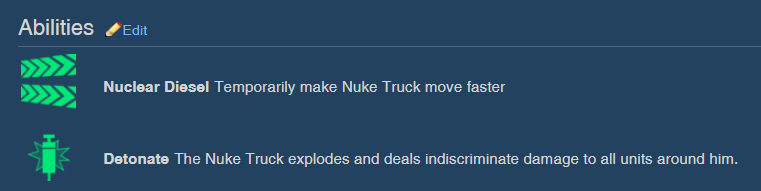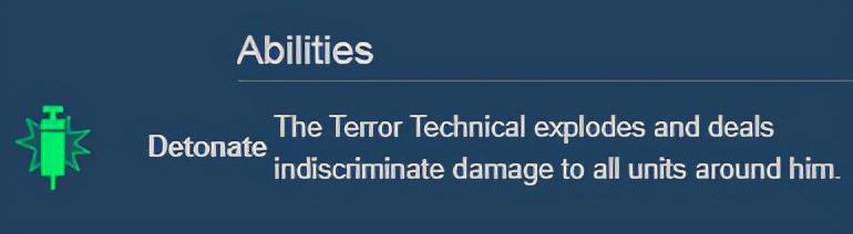 技能:1.核柴油机:暂时加速;2.自爆:对附近所有单位造成伤害(含友军)