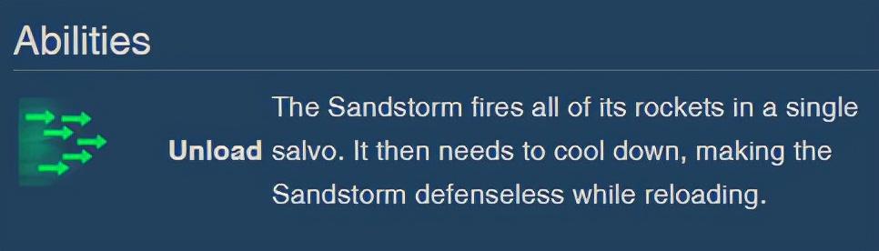技能:齐射所有火箭弹,之后需要冷却,装填期间无攻击能力