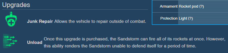 升级:1.允许齐射所有火箭弹;2.垃圾修理:允许车辆在非战斗状态下自行修理