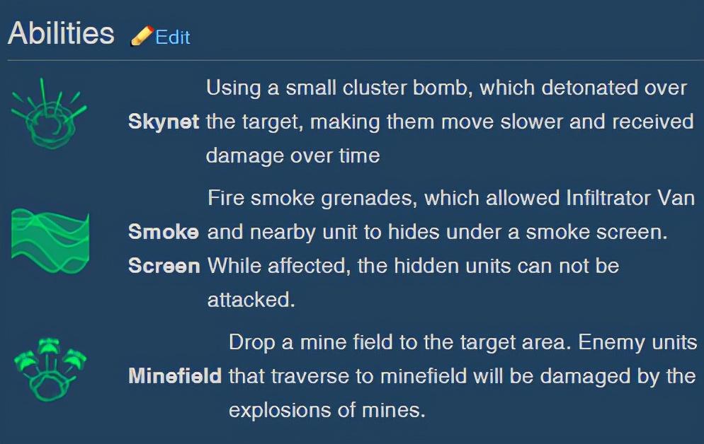 技能:1.天网:在目标上空引爆一枚集束炸弹,减慢它的速度并造成持续伤害;2.烟雾弹:发射烟雾弹掩护周围单位,烟雾内的目标不能被攻击;3.雷区:设置地雷,敌人经过时爆炸