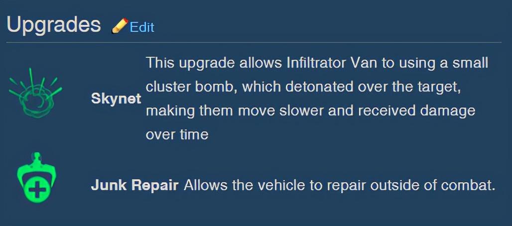 升级:1.允许使用天网技能;2.垃圾修理:允许车辆在非战斗状态下自行修理