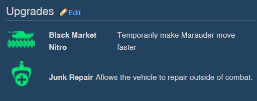 升级:1.允许使用加速能力;2.垃圾修理:允许车辆在非战斗状态下自行修理