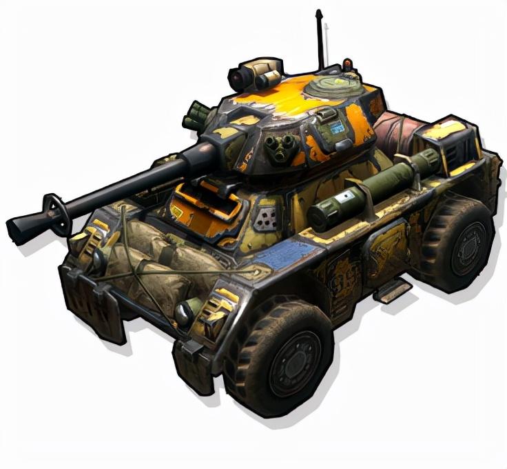 技能:死亡印记:发射一次大威力炮击,如果击毁敌军,则在短时间内加速射击升级:溅射伤害外形像现实中美国的T17E1“猎鹿犬”装甲车