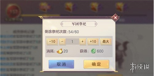 3、祭祀。当军团祭祀值达到一定数量的时候,就会获取很多礼品。当然啦,每天除了一次免费祭祀,后面一次祭祀需要20个金宝,相应的能获取600个功勋。