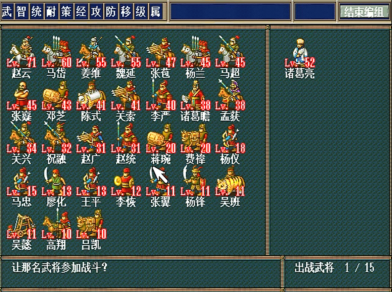 为了让孔明传难度变低,除了游戏前期必死的关张加黄忠,其余蜀国名将都可以活到最后,在主力部队的选择上更加容易。