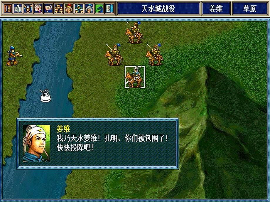 姜维的第一次出场是在第25关-天水城战役之前的剧情中,这时的姜维还是敌将,并且一出场就是献计抵御诸葛亮。