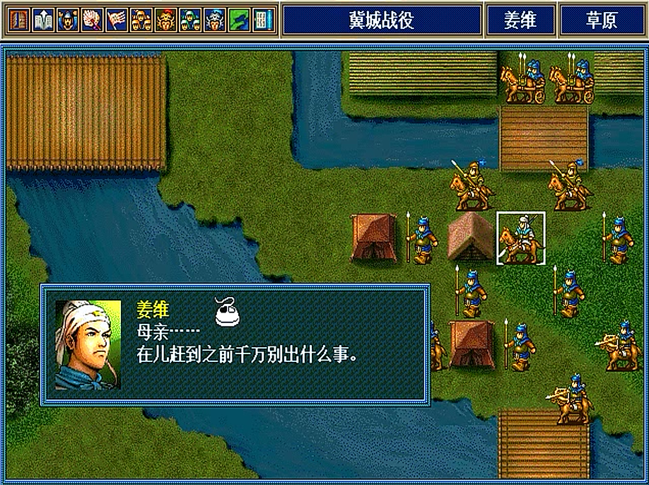 接下来的一关冀城战役中,姜维因为母亲的关系,中了诸葛亮的计,这也是姜维第二次作为敌人登场的战役。这关之后,姜维就会加入我方。