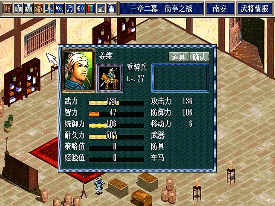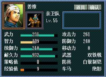 在三国志孔明传中,我方的将领进进出出还是比较多的,其中骑兵这个职业是最多的,并且全部是名将,刚开始关羽、张飞等,虽然会离队,但也是实打实的名将,而赵云是一开始就在队,加上前期加入的魏延,中期的马超和关兴,这些在三国游戏中,同样都是猛男,后期加入的姜维同样是骑兵,但由于姜维加入时间比较迟,在等级上并不占优势,所以一些玩家就会忽略对姜维的培养。其实姜维的等级比较容易提升,如果同等级的情况下,比魏延、马超和关兴都要强一点,当然,由于升级加属性是随机的,会不会比其他骑兵强也不一定,但我玩的时候,最后结局时,姜维是除了赵云之外,最强的骑兵。