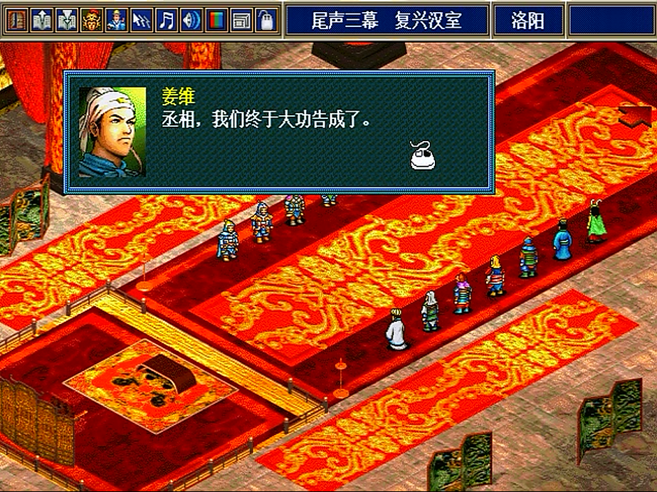 后期剧情中,姜维的戏份也非常多,只是结局却只有这一句话的画面,因为这个游戏是孔明传,并不是姜维传,结局画面自然更多的给到了诸葛亮。