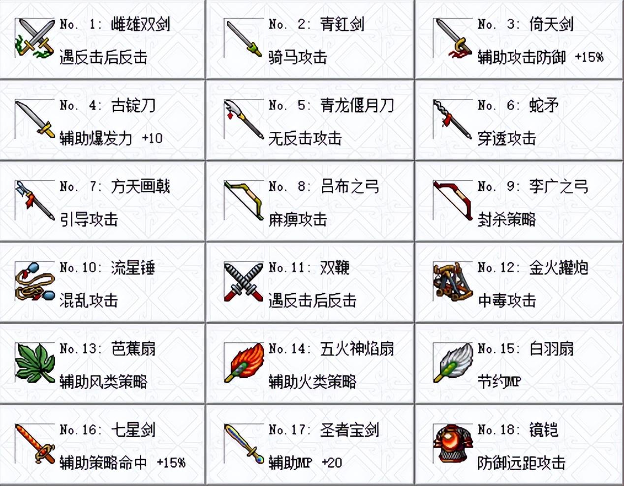 蛇矛的特性为穿透攻击,也就是攻击前面的敌人,敌人身后的人也会跟着中招,这件装备张辽和夏侯惇都非常适用,其实其他骑兵也很适用,但一般上不了场就不考虑了。游戏中骑兵最重要的两件武器就是蛇矛和方天画戟。