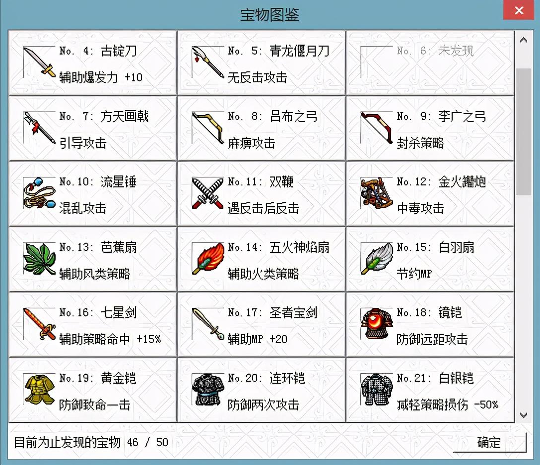 曹操传一共有50样宝物,在不依靠修改器的情况下,想集齐宝物至少需要玩两遍,这还是在参照攻略的情况下,不然的话可能玩几遍都拿不齐全。当然,现在很多玩家重温游戏已经不需要攻略了,玩了太多遍后基本上的流程都会背了。