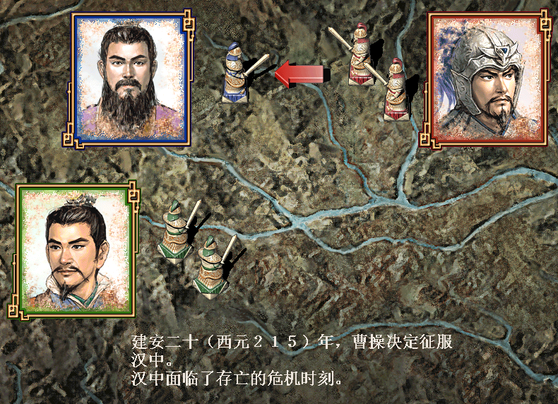 我们先看剧情背景,曹操击败了马超,平定了雍凉;失败的马超归降了刘备,助刘备取得了西川。这个时候曹操感觉到危机,为了抢先刘备一步,先出击汉中。