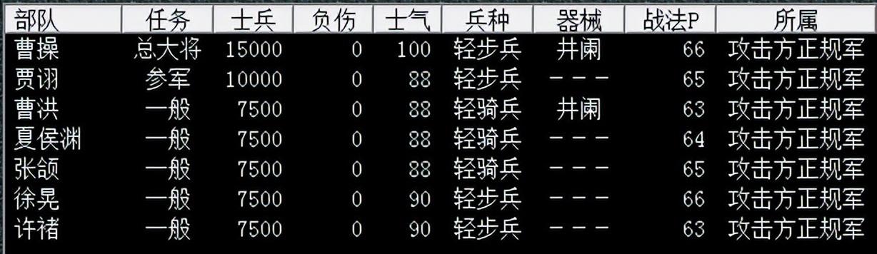 进入战场,首先兵力方面敌军7.5万,我军6.25万,略微下风,我军曹操和贾诩1万+,其它各将领都是7千5百。这次出战有徐晃和张郃两位五子良将、虎痴许褚、虎步关右的夏侯渊和曹洪,实力不俗。