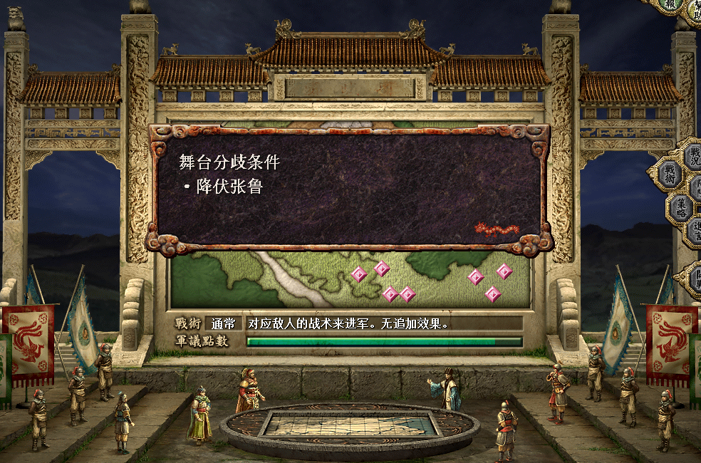 开场参军贾诩介绍了张鲁的五斗米教在汉中深得人心,然后曹操琢磨如果说服张鲁投降就好了。难度这关后两个分叉的条件,就在于能否降伏张鲁?