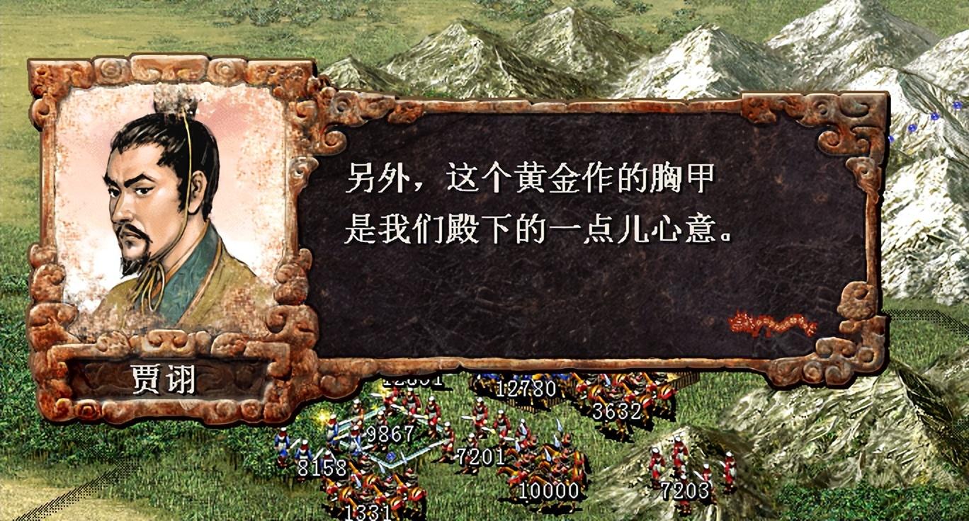 贾诩上前触发剧情,贾诩献出黄金作的胸甲,杨松满嘴答应散布谣言,说庞德是降将,随时会投降曹操。