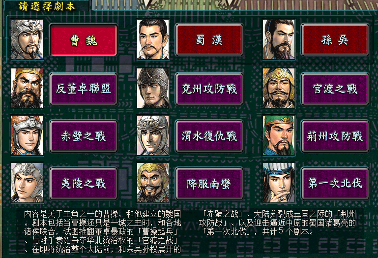 1、剧本是相当的丰富!上一作仅有几个剧本,本作分为8个篇章,从184年到234年足足51个剧本(每1年1个)+后期3个剧本