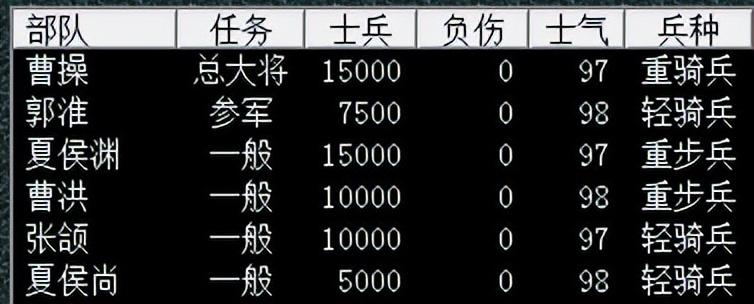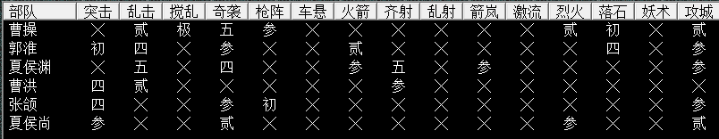 小编认为野战最重要是利用好战法,从地形可知砦的位置是山地(定军山嘛),前面是草原,后面是平原,没有森林和沼泽。因此我军重点也是分类,通过上图可以分析出擅长山地作战的有:曹老板、夏侯渊(张郃、郭淮算堪用);擅长平原作战的有:张郃、曹洪(夏侯尚算堪用)。这么一盘算,小编就决定好如何安排了。