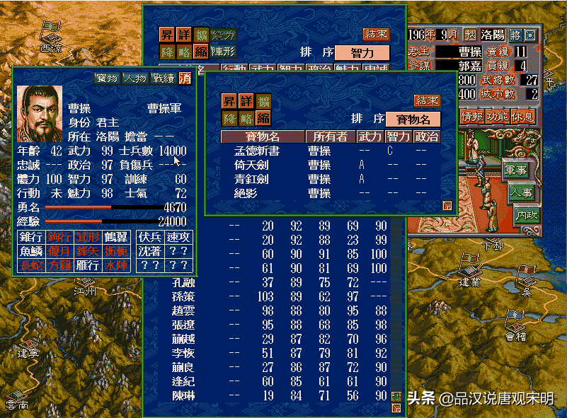 当然,三国志5的另外一个特色,就是宝物的作用实体化。很多能够增加属性的宝物出现,也让游戏中的最高属性突破100点以上。