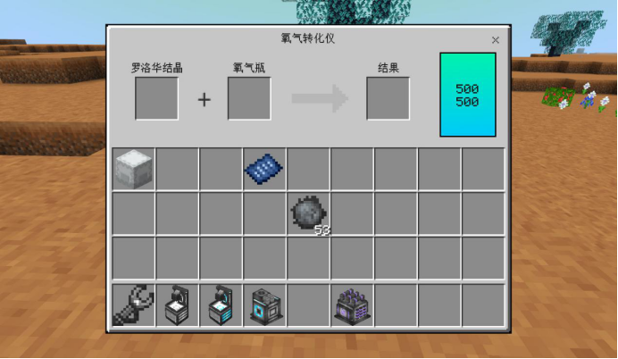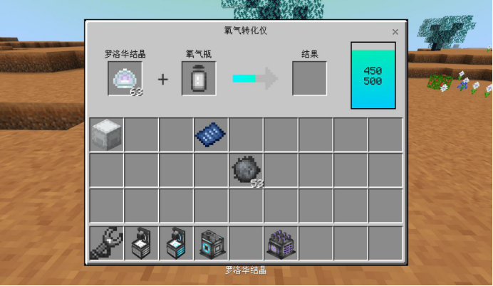 输入氧气原料(罗洛华结晶或罗洛华水结晶)、氧气容器和电能,一定时间后输出装满氧气的氧气容量的机器,一定时间后输出装满氧气的氧气容量的机器。运作时,每秒生成一定量的氧气同时消耗电能。自身可储存一定电能。