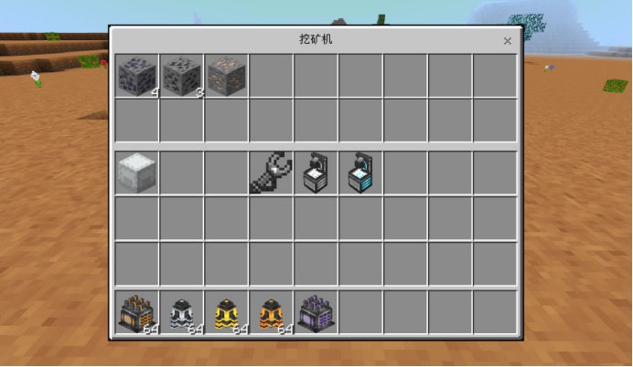 懒人必备的、能够自动获得地下矿产资源的机器,获取地下一定范围内的矿产资源并输出,已获取的矿产位置替换成石头。自身无法储存电能,需要稳定的外部供电才能运作,耗能较大。