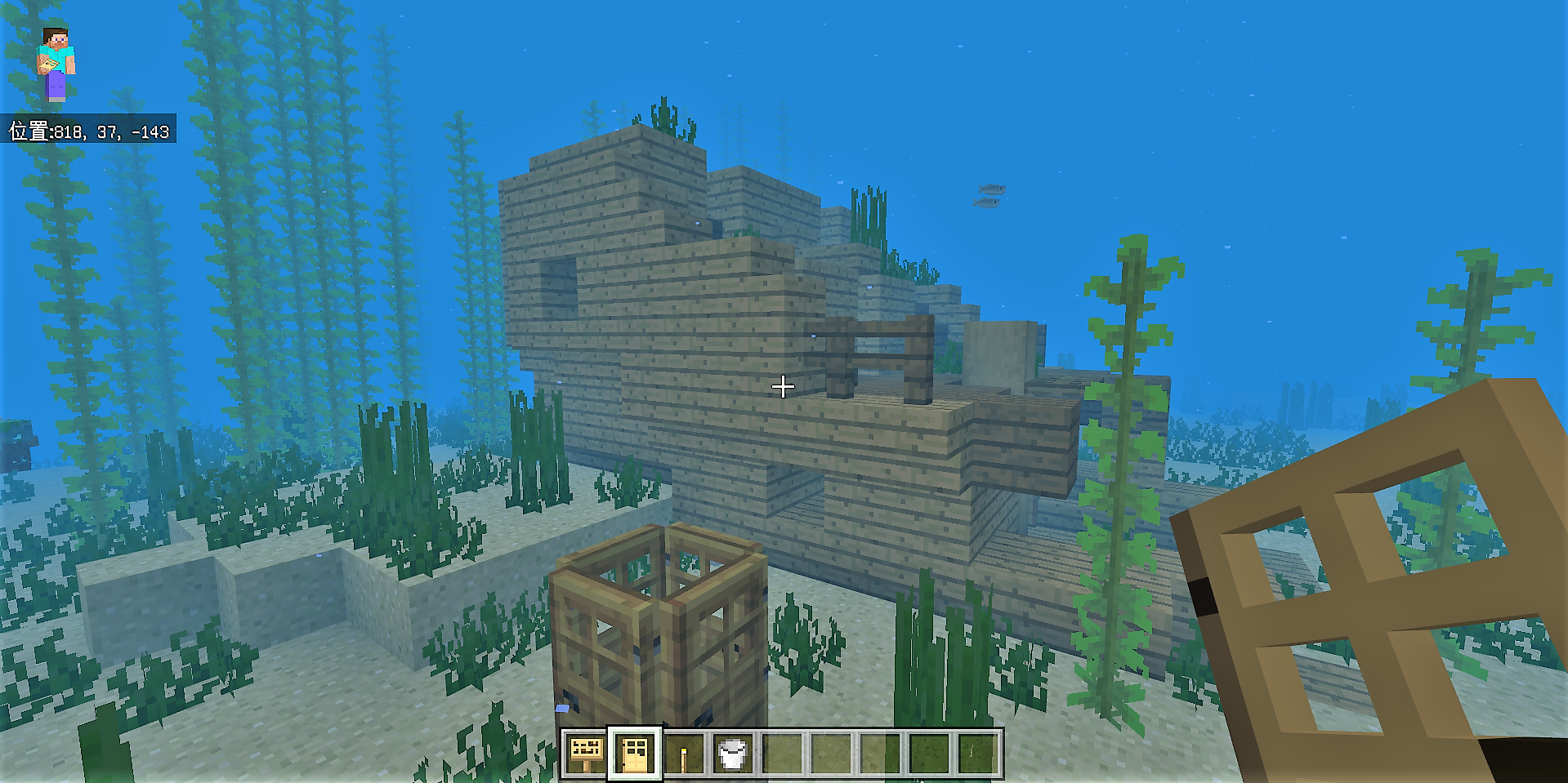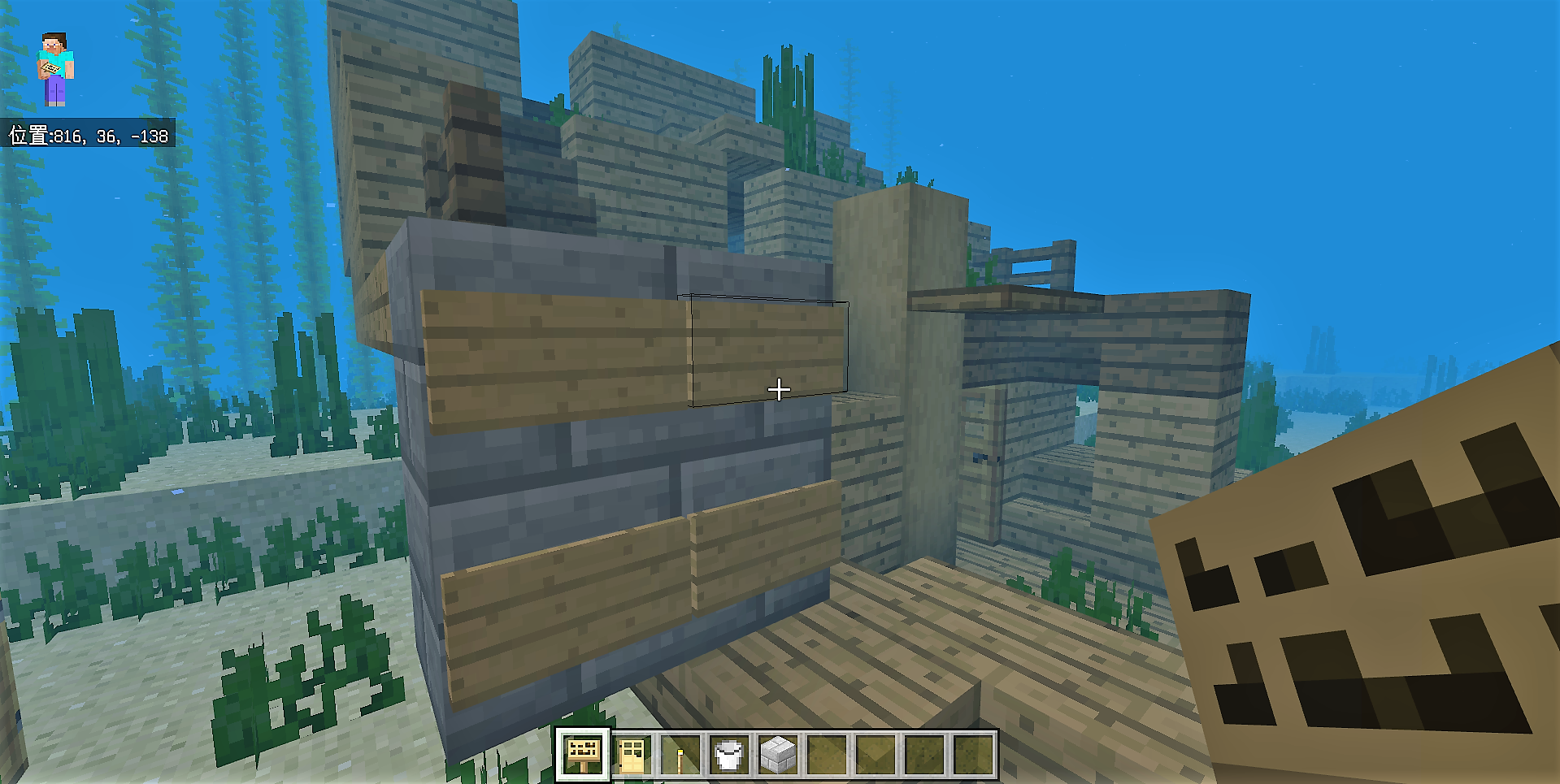 而跟排水不一样,水下搭建简单的呼吸空间,门和告示牌是不二之选。理论上,门会占据两格高的空间,但是又不是完全的实体方块,因此玩家可以轻松在里面获得氧气,告示牌也是这个道理。除此之外,其实半砖和楼梯理论上也是不错的选择,但是海洋版本更新后楼梯的空缺处会被水填满,使用起来风险较大(不怕被憋死的玩家可以一试)。