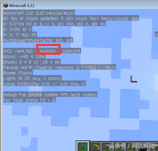 如图所示,有红框标记的就是我所在位置的高度,图上表明我的高度位置是4。如果你想挖钻石就往地下挖到11层高度后,再向四周扩大范围挖,挖到钻石几率很大。