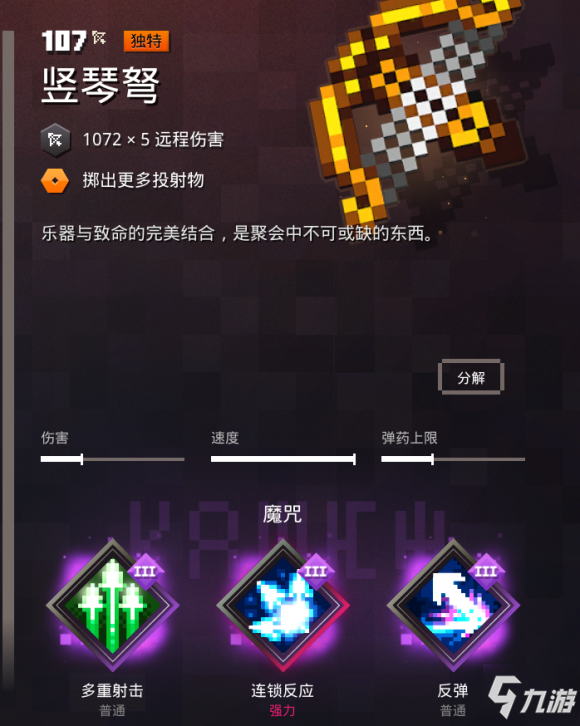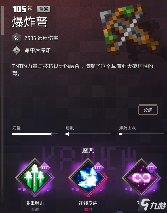 ④:竖琴弩 附魔(反弹&多重&连锁) 最强远程没有之一 配合烟花简直是毁天灭地的最强存在 因为多重设计和连锁都是每一支箭都会触发 这把弩自带5次设计 你想想20多支连锁+反射的烟花是什么概念 一发炸掉一图怪轻轻松松