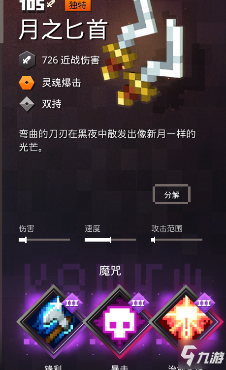 近战输出:①:月之匕首 附魔(锋利&暴击&治愈)最强单体输出没有之一,在灵魂和暴击的双重附魔下 粗略能有50%的爆率 加上匕首攻速和面板 在弱化锣下BOSS只能成那么一瞬间