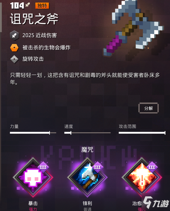 ③:诅咒之斧 附魔(锋利&暴击&治愈)最强群体近战武器 每一发都是360范围伤害 而且面板极高 107能有2260+的面板 配合锋利暴击 一刀一个小怪 再加上自带爆炸附魔 绝对是清图最强近战武器没有之一