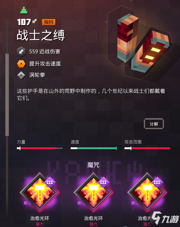 ②:战士之缚 附魔(治愈X3) 最强最肉的武器没有之一 因为攻速快 所以几乎无限触发光环 3个叠加一起奶一口3000以上 加上叛徒甲25%的攻速和20%近战伤害 再配合胆怯附魔 一拳也有900的输出 虽然总体输出弱于月之匕首 但站撸一堆附魔怪轻轻松松