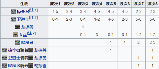 在触发袭击开始前,我们需要先确立袭击难度。“不祥之兆”debuff是一个可以提升的效果,通过不断击败厄运巡逻队队长,最高可以达到6级效果。在村庄触发袭击事件的同时,系统会根据“不祥之兆”等级来提升袭击波数,最低一波,最高8波;奖励自然也随着袭击难度的提升而增加,无论是战利品数量还是村民的回馈内容都会在高难度的情况下变得非常丰富。这里需要注意的是,基岩版中,袭击事件的波数并不会依据“不祥之兆”的等级来定,而完全是根据游戏的难度确定。