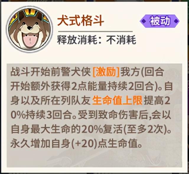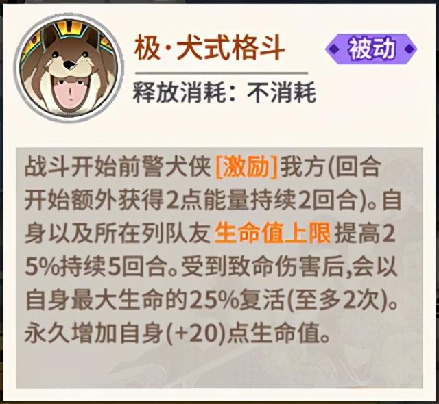 分析:警犬侠的复活机制为不屈,在受到致命伤害后会立刻复活,倘若此时仍处于敌方单回合攻击火力覆盖下,我方警犬侠仅20%或25%的最大生命复活上限可能抵挡不住伤害,又触发不屈。